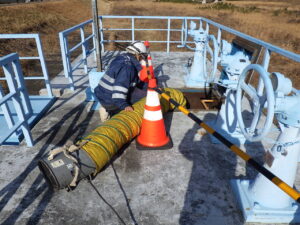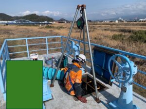• 酸素・ガス濃度の測定: 入孔する前に、ガス検知器にて酸素濃度(18%以上)および硫化水素濃度(10ppm以下)を確認します。